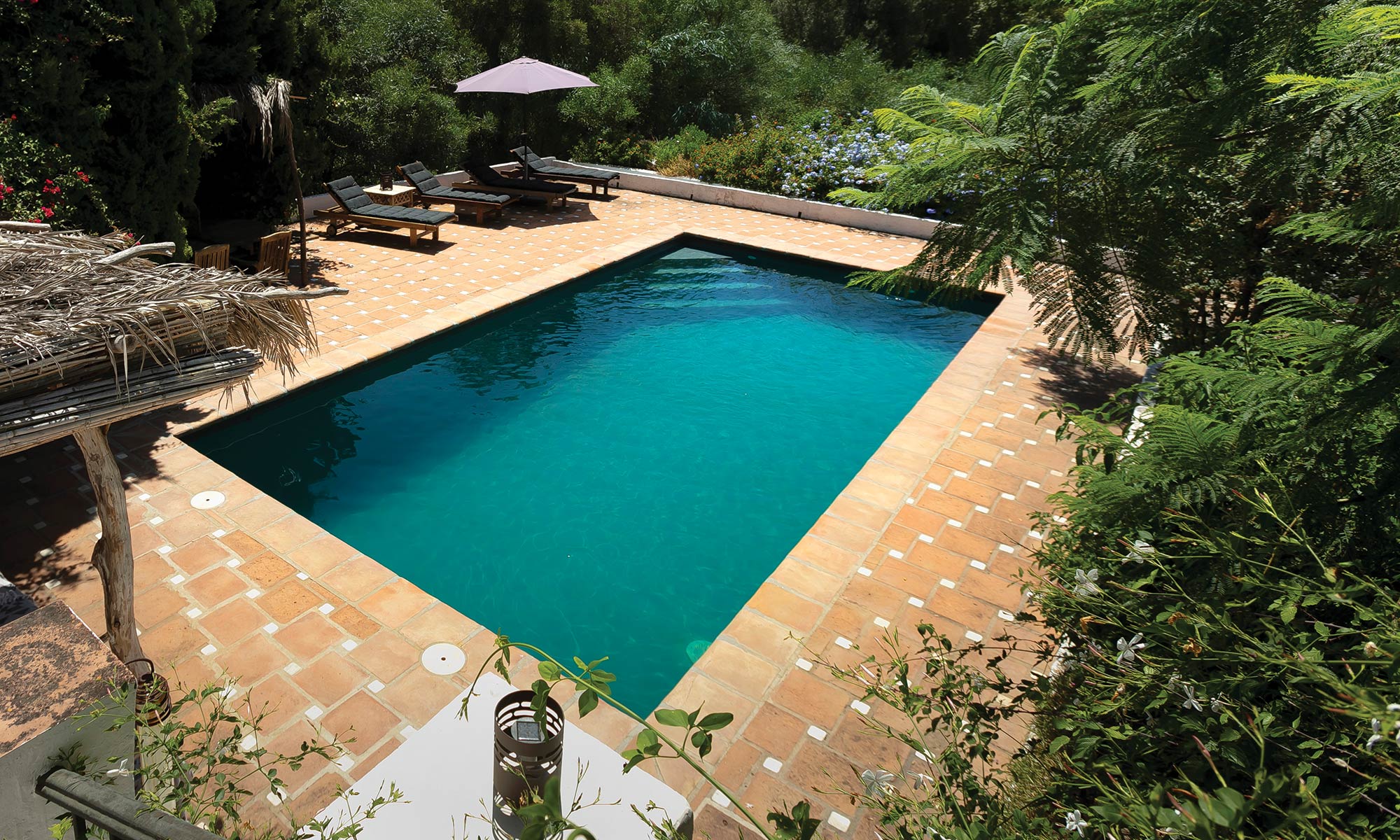 So many magical parts of this luxurious yet sustainable oasis are the work of different members of the family. This includes a gorgeous table setting beneath the 300-year-old oak in the garden. Likewise, the poolside relaxation area, covered with a palm leaf roof.